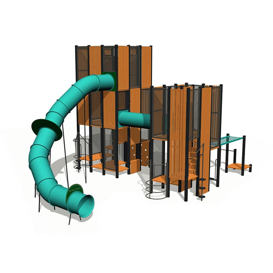 The playground has several different play elements incorporated into the design. The main structure is a large tower featuring a large, curved tunnel slide.